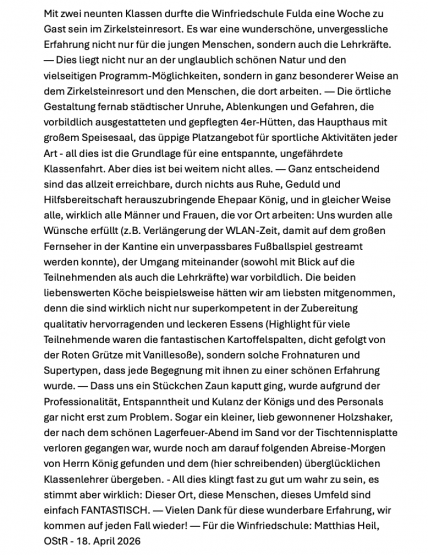 Wer könnte besser beschreiben, was das ZirkelsteinResort so besonders macht, als diejenigen, die selbst hier zu Gast waren? Die folgende Danksagung der Winfriedschule Fulda zeigt eindrucksvoll, wie viel mehr eine Klassenfahrt bei uns sein kann: gemeinsame Erlebnisse inmitten wunderschöner Natur, vielseitige Freizeitmöglichkeiten, herzliche Gastfreundschaft und ein Umfeld, in dem sich Schülerinnen, Schüler und Lehrkräfte gleichermaßen wohlfühlen.