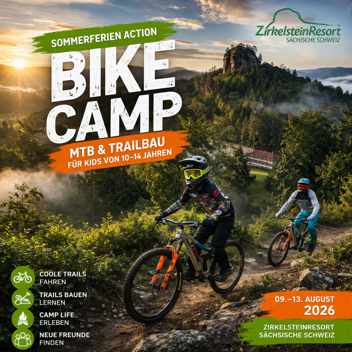 Fünf Tage voller Action, Natur und unvergesslicher Erlebnisse: Beim MTB- und Trailbau-Camp im ZirkelsteinResort erwartet Kinder im Alter von 10 bis 14 Jahren ein abwechslungsreiches Ferienprogramm mitten in der Sächsischen Schweiz.